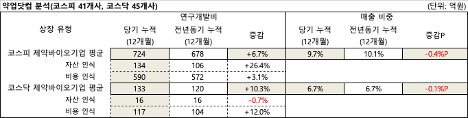 코스닥 제약·바이오 45개사의 경우 누적 평균 연구개발비가 전년 동기 대비 10.3% 증가한 133억원(매출 비중 6.7%)을 기록했다. 코스피와 코스닥 모두 전년 대비 뚜렷한 R&D 투자 확대 기조를 달성하며 폭발적인 미래 질적 성장세를 보여주었다.