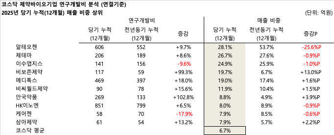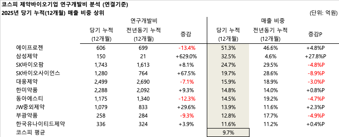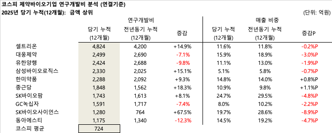 약업닷컴이 상장 제약·바이오 기업(코스피 41개사, 코스닥 45개사)의 2025년 누적 연구개발비를 분석한 결과, 코스피 제약·바이오 41개사의 2025년 누적 평균 연구개발비는 전년 동기 대비 6.7% 증가한 724억원(매출 비중 9.7%)을 기록했다.