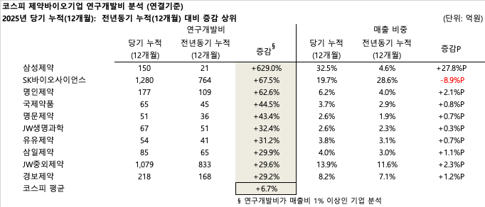 전년동기 대비 연구개발비 증감률은 삼성제약이 629.0% 수직 상승하며 파이프라인 확대를 위한 공격적인 투자를 강하게 견인한 것으로 분석된다. 아울러 SK바이오사이언스, 명인제약, 국제약품 등 체질 개선 및 차세대 동력을 발굴하는 기업들이 상위권에 대거 포진하며 실질적인 R&D 투자의 반등 흐름이 꾸준히 이어지고 있음을 증명했다. 주요 성장 기업들의 순위와 증감률을 살펴보면 1위 삼성제약(+629.0%), 2위 SK바이오사이언스(+67.5%), 3위 명인제약(+62.6%), 4위 국제약품(+44.5%), 5위 명문제약(+43.4%), 6위 JW생명과학(+32.4%), 7위 유유제약(+31.2%), 8위 삼일제약(+29.9%), 9위 JW중외제약(+29.6%), 10위 경보제약(+29.2%) 순으로 나타났다.