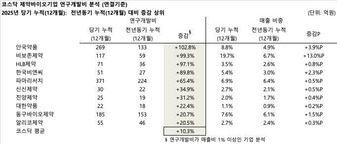 전년동기 대비 연구개발비 증감률은 안국약품이 102.8% 수직 상승하며 공격적인 미래 먹거리 투자를 강하게 견인한 것으로 분석된다. 아울러 비보존제약, HLB제약, 한국비엔씨 등 연구개발 포트폴리오 다각화에 집중한 기업들이 상위권에 대거 포진하며 관련 기업들의 고공행진이 꾸준히 이어지고 있음을 증명했다. 주요 성장 기업들의 순위와 증감률을 살펴보면 1위 안국약품(+102.8%), 2위 비보존제약(+99.3%), 3위 HLB제약(+97.1%), 4위 한국비엔씨(+89.8%), 5위 파마리서치(+65.4%), 6위 신신제약(+34.9%), 7위 진양제약(+31.2%), 8위 대한약품(+22.4%), 9위 동구바이오제약(+20.7%), 10위 알리코제약(+20.5%) 순으로 나타났다.