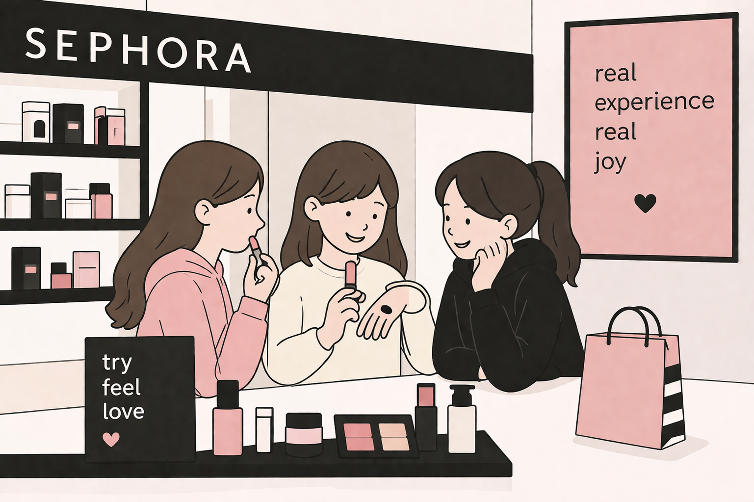 최근 10대 초반 아이들이 매장으로 몰려가 화장품을 직접 발라보고 노는 '세포라 트윈에이저' 현상이 두드러지는 것도 같은 맥락이다. 화면 속 영상으로만 뷰티를 접하던 어린 세대가 오프라인 매장을 찾아 물리적 체험을 직접 소비하기 시작한 것이다.