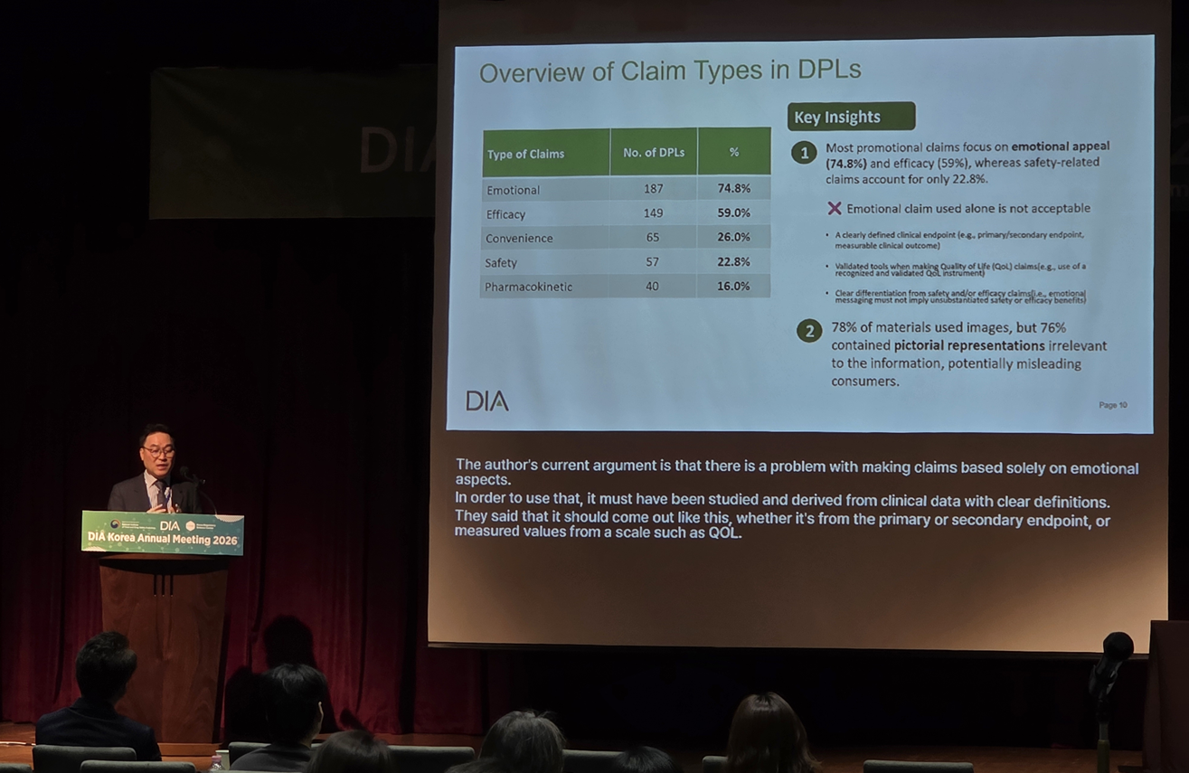 한국릴리 김신걸 MedInfo and Channels Lead는 DIA Korea Annual Meeting 2026(연례회의)에서 ‘Scientific Accuracy and Compliance in Promotional Activities’를 주제로 발표를 진행했다. 그는 제약사의 판촉 활동이 과학적 근거에 기반해 정확하게 이루어져야 하며, 오인 가능성을 최소화하는 체계적 관리가 필요하다고 강조했다.