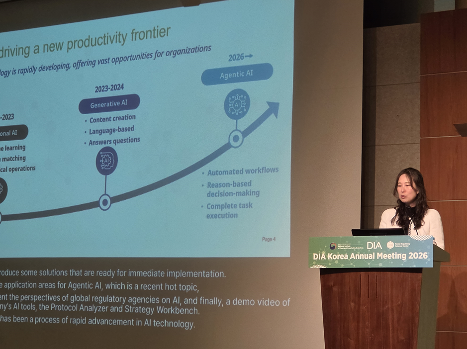 최혜진 IQVIA JAPAC Operations 헤드는 ‘DIA Korea Annual Meeting 2026(연례회의)’에서 ‘더 스마트한 임상시험 설계 - AI 기반 임상 설계 및 프로토콜 최적화(Smarter Trials Design - AI Powered Clinical Design and Protocol Optimization)’을 주제로 발표하며 AI 기반 임상 설계 혁신 방향을 설명했다.