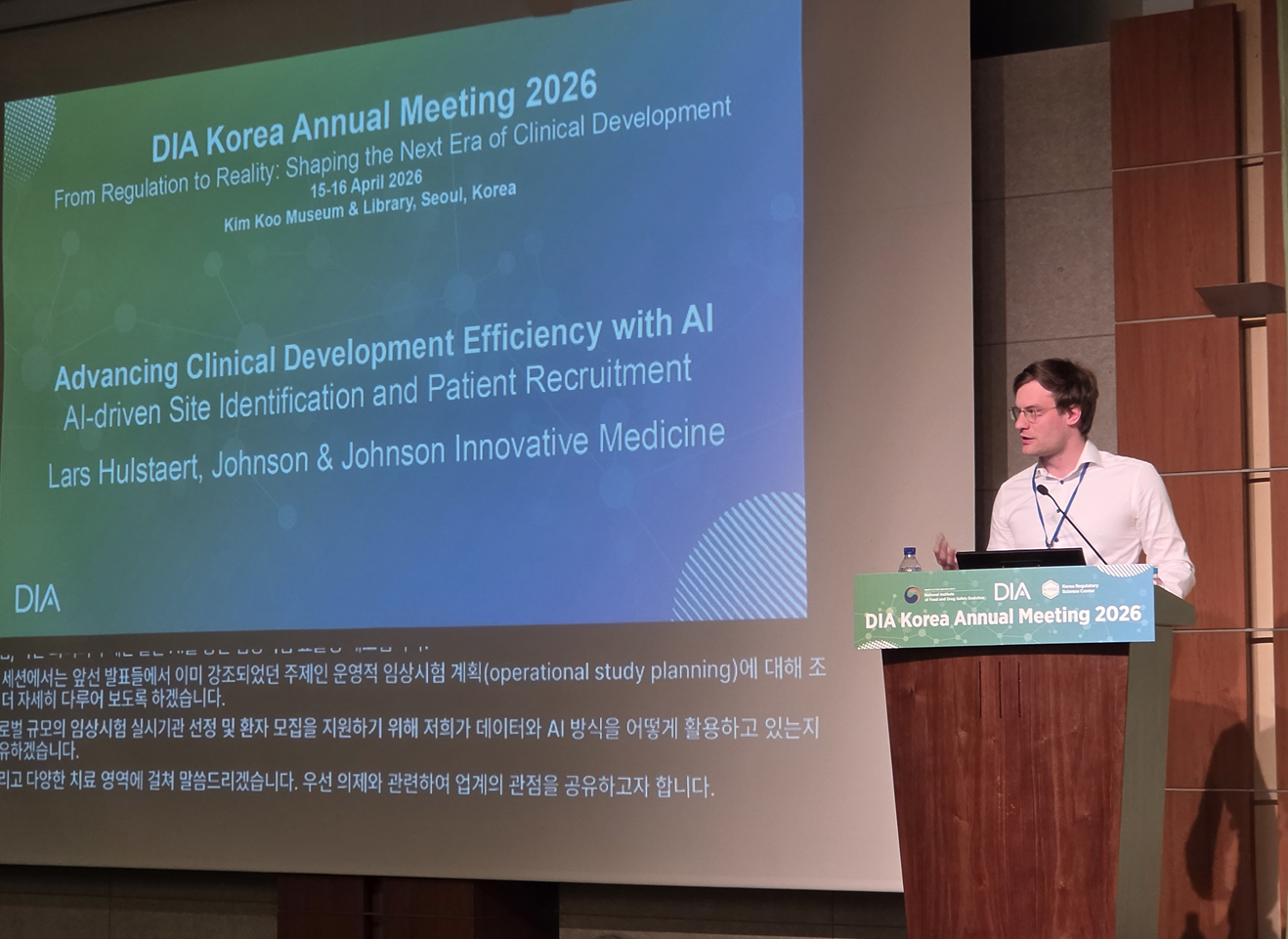 존슨앤드존슨 이노베이티브 메디슨(Johnson & Johnson Innovative Medicine)의 라스 홀스타트(Lars Hulstaert) 데이터사이언스 디렉터(Director of Data Science)는 ‘DIA Korea Annual Meeting 2026(연례회의)’에서 ‘AI 기반 임상시험 실시기관 선정 및 환자 모집(AI-driven Site Identification and Patient Recruitment)’를 주제로 발표하며 AI 기반 임상 운영 혁신 방향을 설명했다.
