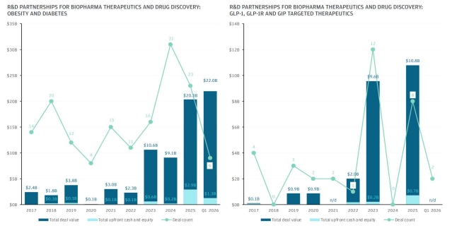 J.P.모건이 16일 발간한 2026년 1분기 바이오제약 라이센싱 및 벤처 보고서’에 따르면 2026년 1분기 비만 및 당뇨병 분야 연구개발(R&D) 파트너십 총 계약 금액은 220억 달러로, 2025년 전체 수준인 203억 달러를 초과했다. 선급 현금과 주식도 2026년 1분기 13억 달러 로 이미 지난해 한해 203억 달러의 거의 절반 수준에 달했다.