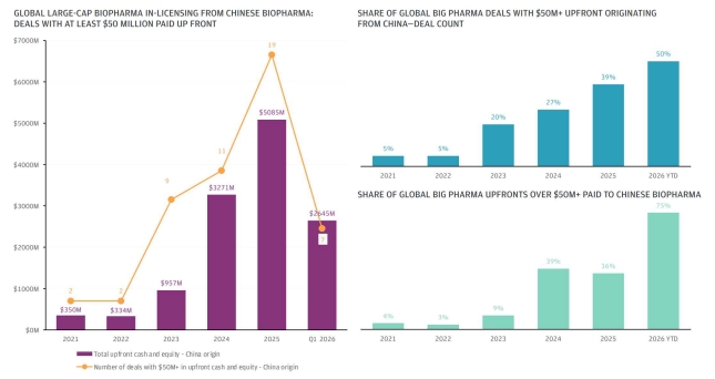 2026년 1분기 동안 글로벌 대형 바이오제약사들은 중국 바이오제약사로부터 자산을 지속적으로 확보했다. 최소 5,000만 달러 선급금이 지급된 7건의 거래에서 총 선급 현금 및 주식은 26억 달러에 달했다.