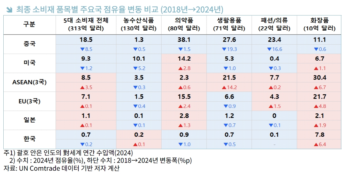 하지만 화장품 부문은 예외적으로 높은 성장세를 보였다. 인도 최종 소비재 화장품 시장에서 한국 점유율은 2018년 1.4%에서 2024년 7.8%로 높아지며 뚜렷한 존재감을 나타냈다. 한국 화장품은 수출 규모 자체가 아직 크지 않지만 성장 잠재력이 높은 분야이자, 소비재 품목군 가운데 가장 선명한 경쟁력을 보인 핵심 분야로 평가된다.