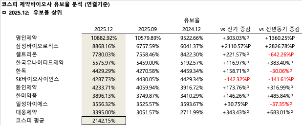 2025년 12월 기준 유보율 규모는 명인제약이 10882.92%를 달성하며 코스피 시장 전체의 재무 건전성을 강하게 견인한 것으로 분석된다. 아울러 삼성바이오로직스, 셀트리온, 한국유나이티드제약 등 대형 위탁생산(CDMO) 및 내실을 갖춘 알짜 중견 기업들이 상위권에 대거 포진하며 안정적인 자본 확충 흐름이 꾸준히 이어지고 있음을 증명했다. 주요 상위 기업들의 순위와 유보율을 살펴보면 1위 명인제약(10882.92%), 2위 삼성바이오로직스(8868.16%), 3위 셀트리온(7780.03%), 4위 한국유나이티드제약(5575.97%), 5위 한독(4429.29%), 6위 SK바이오사이언스(4287.73%), 7위 환인제약(4233.71%), 8위 한미약품(3896.13%), 9위 일성아이에스(3556.32%), 10위 대웅제약(3395.00%) 순으로 나타났다.