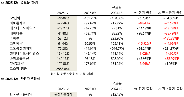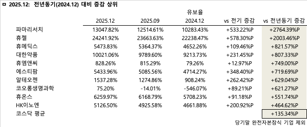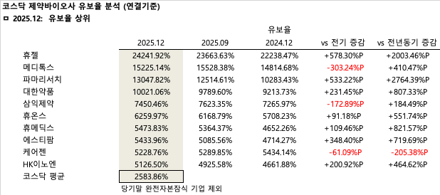 코스닥 제약·바이오 60개사의 경우 2025년 12월 기준 평균 유보율이 2583.86%를 기록해 코스피 시장보다 다소 높은 잉여금 적립 수준을 보였다. 코스닥 역시 전년 동기 대비로는 135.34%p 증가하며 재무 구조가 뚜렷하게 개선되었으나, 전기 대비로는 58.13%p 감소했다.