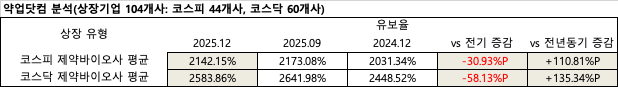 약업닷컴이 상장 제약·바이오 기업 104개사(코스피 44개사, 코스닥 60개사)의 2025년 12월 기준 유보율을 분석한 결과, 코스피 제약·바이오 44개사의 평균 유보율은 2142.15%로 전년 동기 대비 110.81%p 증가했으나, 전기 대비로는 30.93%p 소폭 감소한 수치를 보였다.