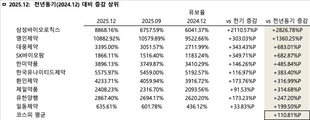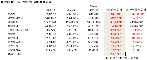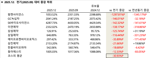 전기 대비 유보율 증감률은 삼성바이오로직스가 2110.57%p 수직 상승하며 단기 잉여금 확충 기조를 강하게 견인한 것으로 분석된다. 아울러 SK바이오팜, 대웅제약, 명인제약 등 실적 호조에 따른 이익 결실을 맺은 기업들이 상위권에 대거 포진하며 뚜렷한 재무구조 개선이 꾸준히 이어지고 있음을 증명했다. 주요 상승 기업들의 순위와 증감%p를 살펴보면 1위 삼성바이오로직스(+2110.57%p), 2위 SK바이오팜(+349.71%p), 3위 대웅제약(+343.43%p), 4위 명인제약(+303.03%p), 5위 셀트리온(+221.57%p), 6위 환인제약(+173.76%p), 7위 유한양행(+173.23%p), 8위 한독(+158.71%p), 9위 한미약품(+146.26%p), 10위 한국유나이티드제약(+116.97%p) 순으로 나타났다.