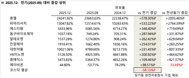 전기 대비 유보율 증감률은 휴젤이 578.30%p 수직 상승하며 단기적인 잉여금 팽창을 강하게 견인한 것으로 분석된다. 아울러 파마리서치, 에스티팜, 동구바이오제약 등 고마진 사업 영역을 영위하는 기업들이 상위권에 대거 포진하며 코스닥 주력 기업들의 재무 여력 확대가 꾸준히 이어지고 있음을 증명했다. 주요 상승 기업들의 순위와 증감%p를 살펴보면 1위 휴젤(+578.30%p), 2위 파마리서치(+533.22%p), 3위 에스티팜(+348.40%p), 4위 동구바이오제약(+287.94%p), 5위 알테오젠(+262.42%p), 6위 진양제약(+254.01%p), 7위 대한약품(+231.45%p), 8위 HK이노엔(+200.92%p), 9위 휴메딕스(+109.46%p), 10위 에이비온(+98.51%p) 순으로 나타났다.