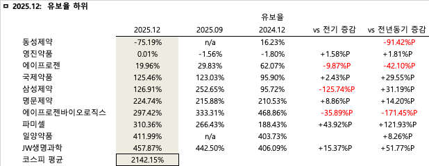 코스피 상장사 중 2025년 4분기 기준 유보율 하위 10개 기업은 동성제약(-75.19%), 영진약품(0.01%), 에이프로젠(19.96%), 국제약품(125.46%), 삼성제약(126.91%), 명문제약(224.74%), 에이프로젠바이오로직스(297.42%), 파미셀(310.36%), 일양약품(411.99%), JW생명과학(457.87%) 순으로 확인됐다.
