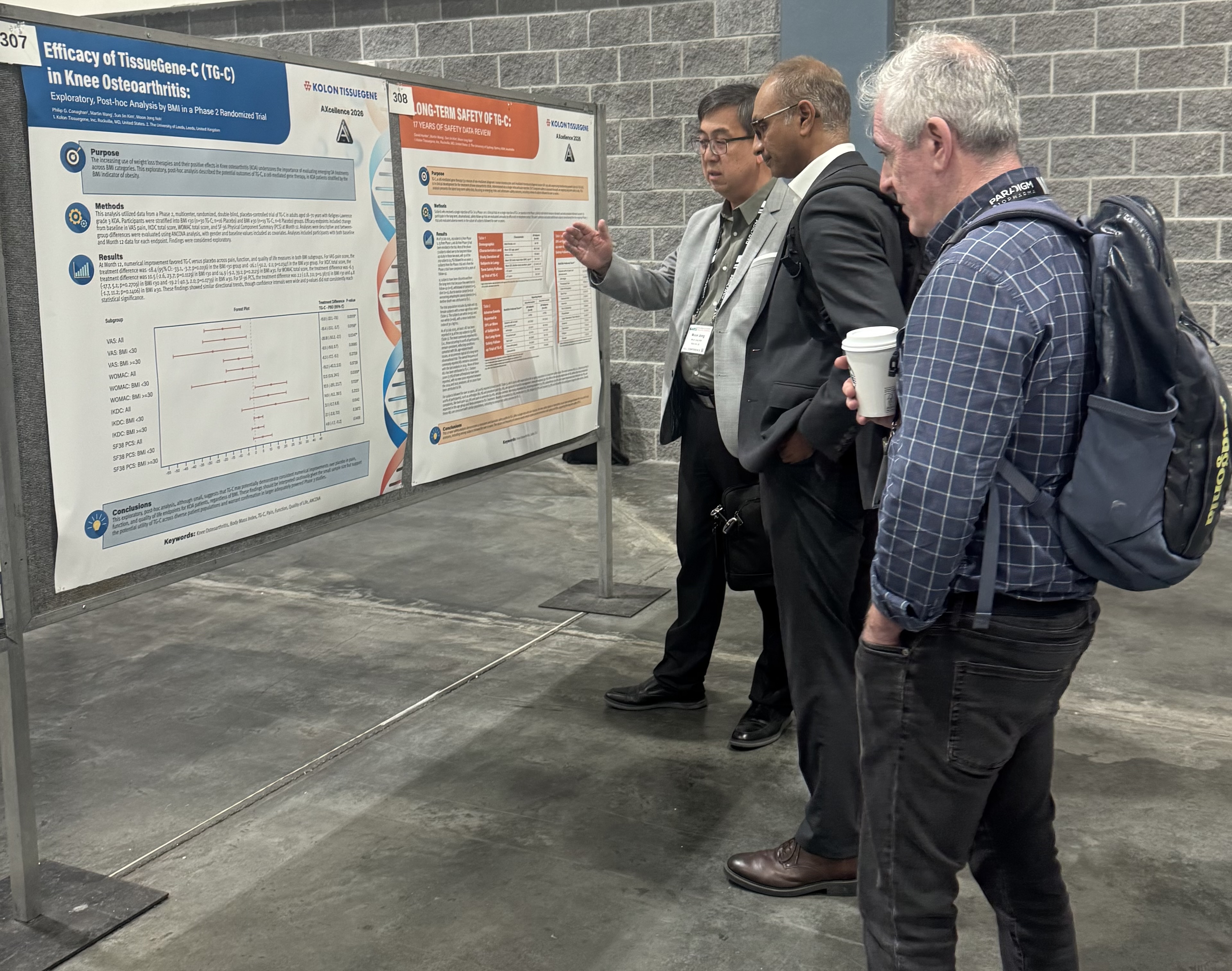 코오롱티슈진이 4월 23일부터 26일까지 미국 플로리다주 웨스트팜비치에서 열린 세계 최고 권위의 국제골관절염학회(The Osteoarthritis Research Society International, 이하 ‘OARSI’) 총회인 World Congress에 참석해 학회 기간 중 포스터 세션을 통해 ▲ 17년 간 TG-C 장기 추적데이터 ▲임상2상 투여환자 관련 체질량지수(BMI)별 TG-C 유효성 분석 결과를 소개했다.