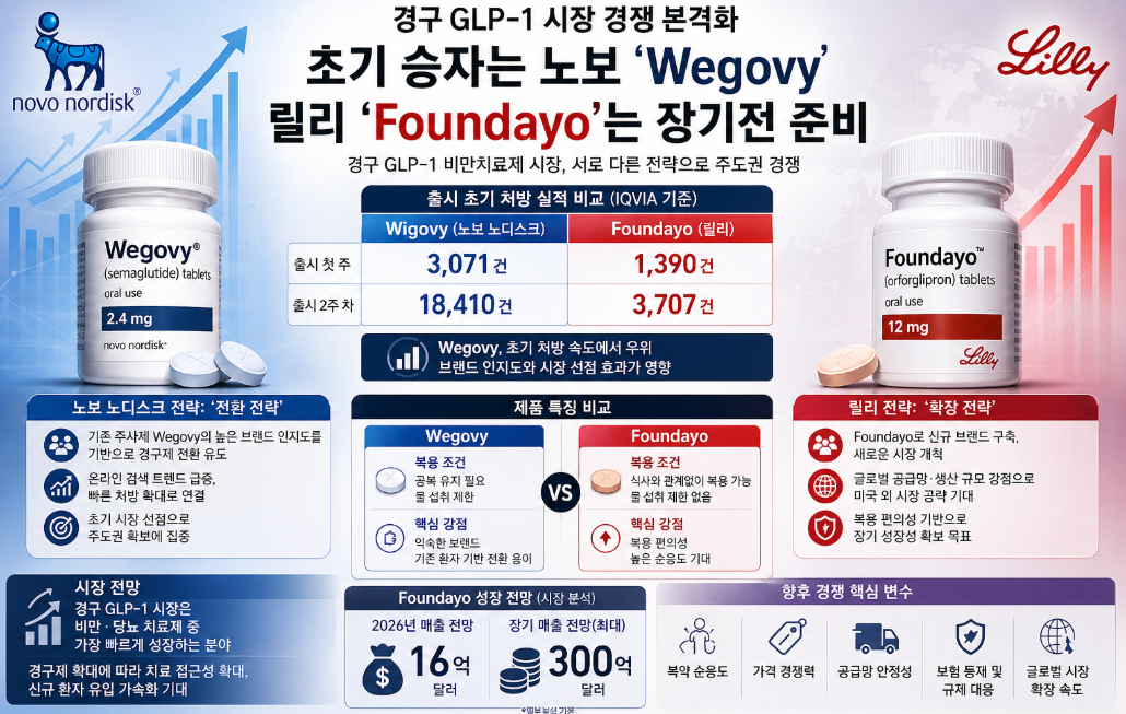비만 치료제 시장이 주사제 중심에서 경구제로 빠르게 이동하면서 글로벌 제약사 간 경쟁 구도 역시 구조적으로 재편되고 있다. 특히 노보 노디스크와 일라이 릴리가 각각 경구용 GLP-1 치료제를 출시하며 본격적인 경쟁에 돌입한 가운데, 초기 시장 반응은 단순한 처방 수치를 넘어 두 기업의 전략적 접근 방식 차이를 선명하게 드러내고 있다.