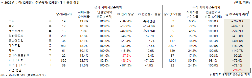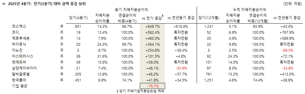 ◇ 2025년 4분기 지배지분순이익금 전기대비 증가율 상위10개사