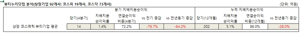 약업신문 자매지 화장품신문이 금융감독원 공시 2026년 3월 분기보고서(연결기준) 분석 결과, 상장 코스메틱 뷰티 기업 92개사(코스피 19개사, 코스닥 73개사)의 지난해 지배지분순이익금평균은 202억원으로 나타났다. 전년동기 대비 28.0% 역성장했다. 지배지분 순이익률은 5.1%, 연결순이익 비중은 86.0%다. 4분기 지배지분순이익금 평균은 14억원이다. 전기 대비 76.7%, 전년동기 대비 64.2% 각각 감소했다. 지배지분 순이익률은 1.4%, 연결순이익 비중은 72.2%다.