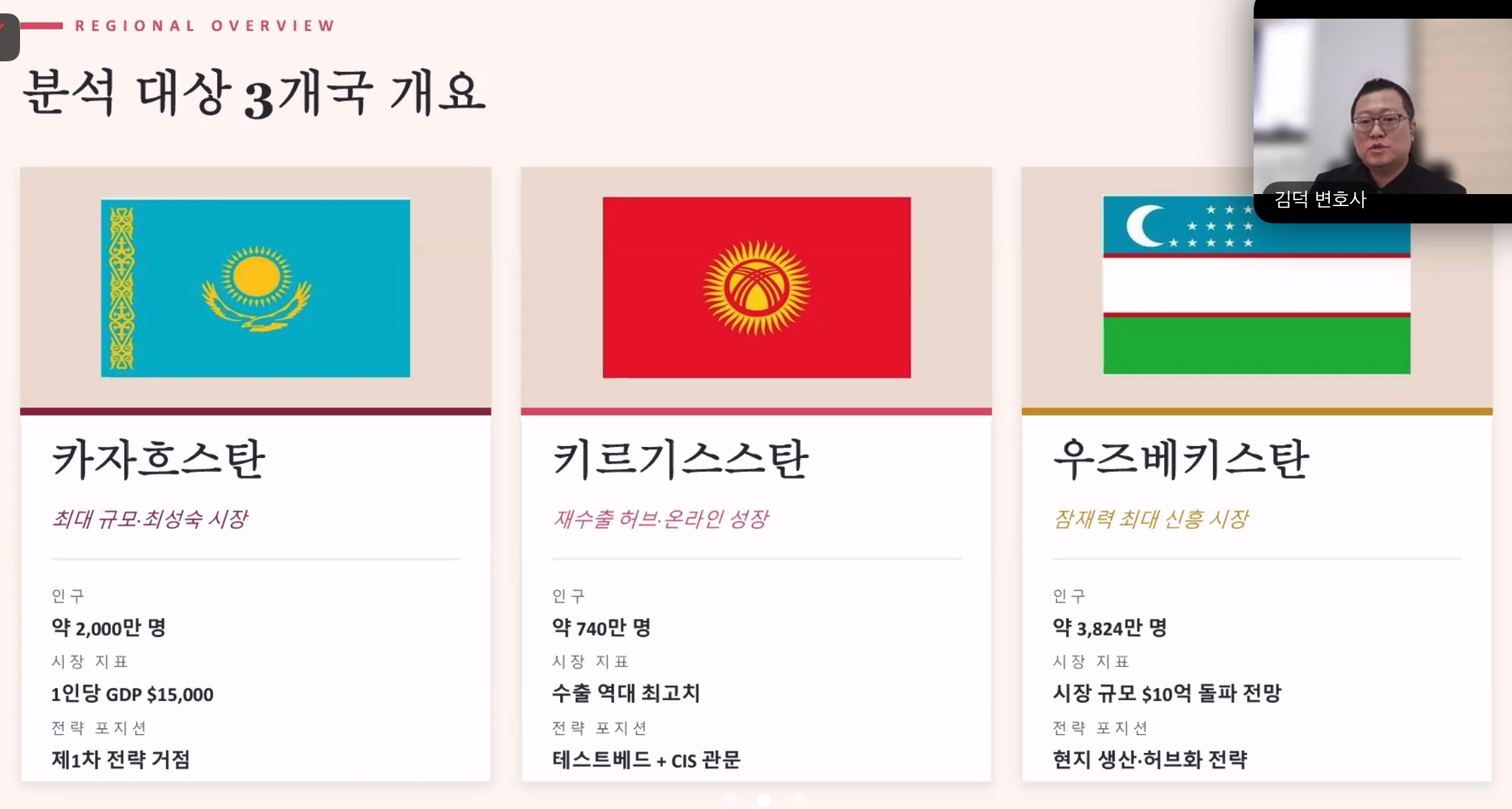 법무법인 지음 김덕 협력 변호사는 "중앙아시아 시장은 러시아 진출과 함께 따라가는 시장이 아니라, 독립된 권역으로 접근해야 할 단계에 들어섰다"며 "카자흐스탄과 우즈베키스탄은 성장 단계와 제도 환경이 다른 만큼 국가별 전략이 필요하다"고 말했다.