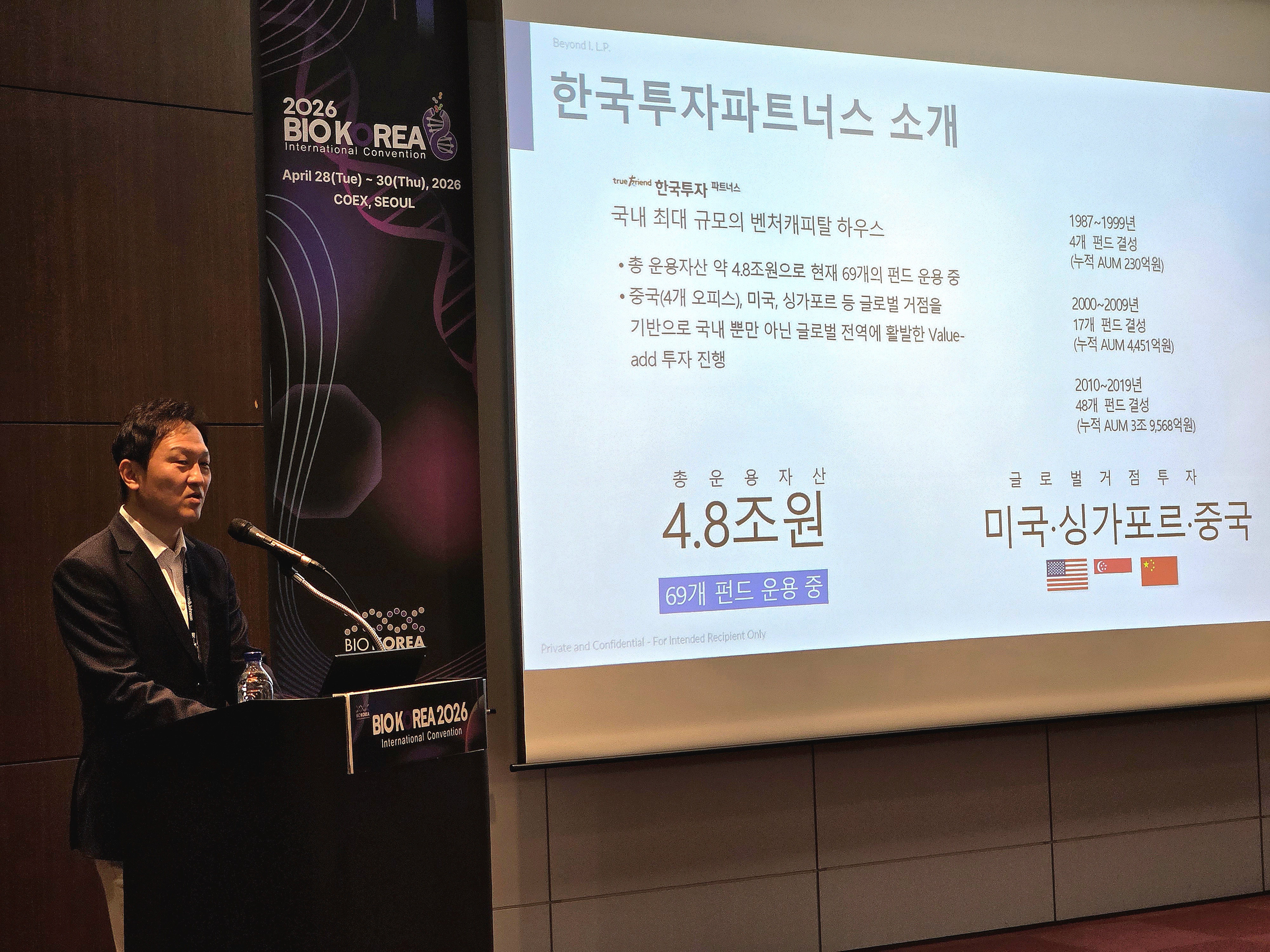 한국투자파트너스 이상우 상무는 29일 서울 코엑스에서 진행된 ‘바이오코리아 2026’의 컨퍼런스 세션 ‘제약바이오 혁신을 위한 글로벌 투자 지형’에 연사로 참여해, ‘바이오 생명과학 분야 투자를 통한 한국과 스웨덴 협력 기회 창출’을 주제로 발표했다.