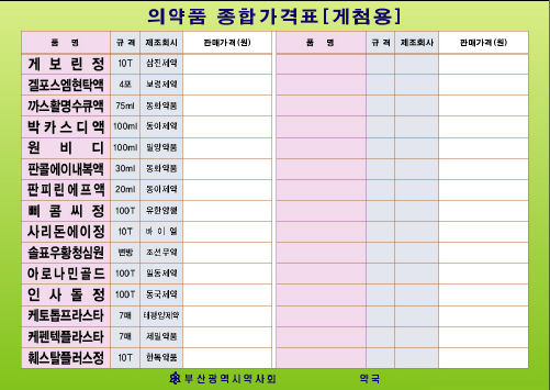 이미 부산시약사회에 앞서 서울 강남구약사회, 경기 고양시약사회가 종합가격표를 자체 제작해 일선약국에 배포했으며 서울 광진구약 역시 시안 검토 후 조만간 배포를 완료할 예정이다.
