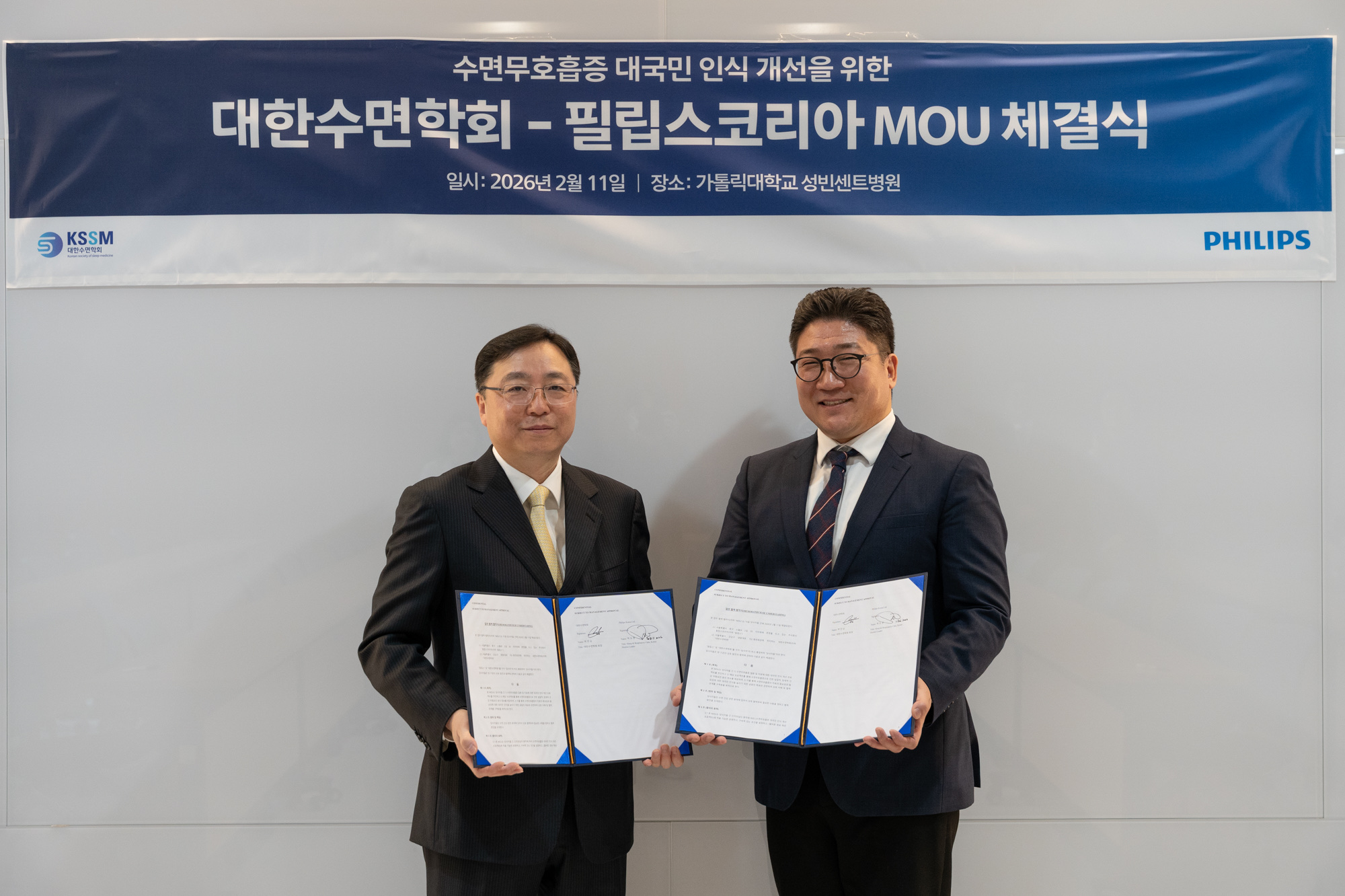 지난 11일 대한수면학회와 필립스코리아는 가톨릭대학교 성빈센트병원에서 협약식을 열고, 수면무호흡증 인식 개선 프로젝트를 중심으로 향후 협력 방향을 논의했다. 이날 행사에는 대한수면학회 박찬순 회장과 필립스코리아 수면 및 호흡기 케어 사업부 박도현 대표를 비롯한 양측 주요 관계자들이 참석했다.