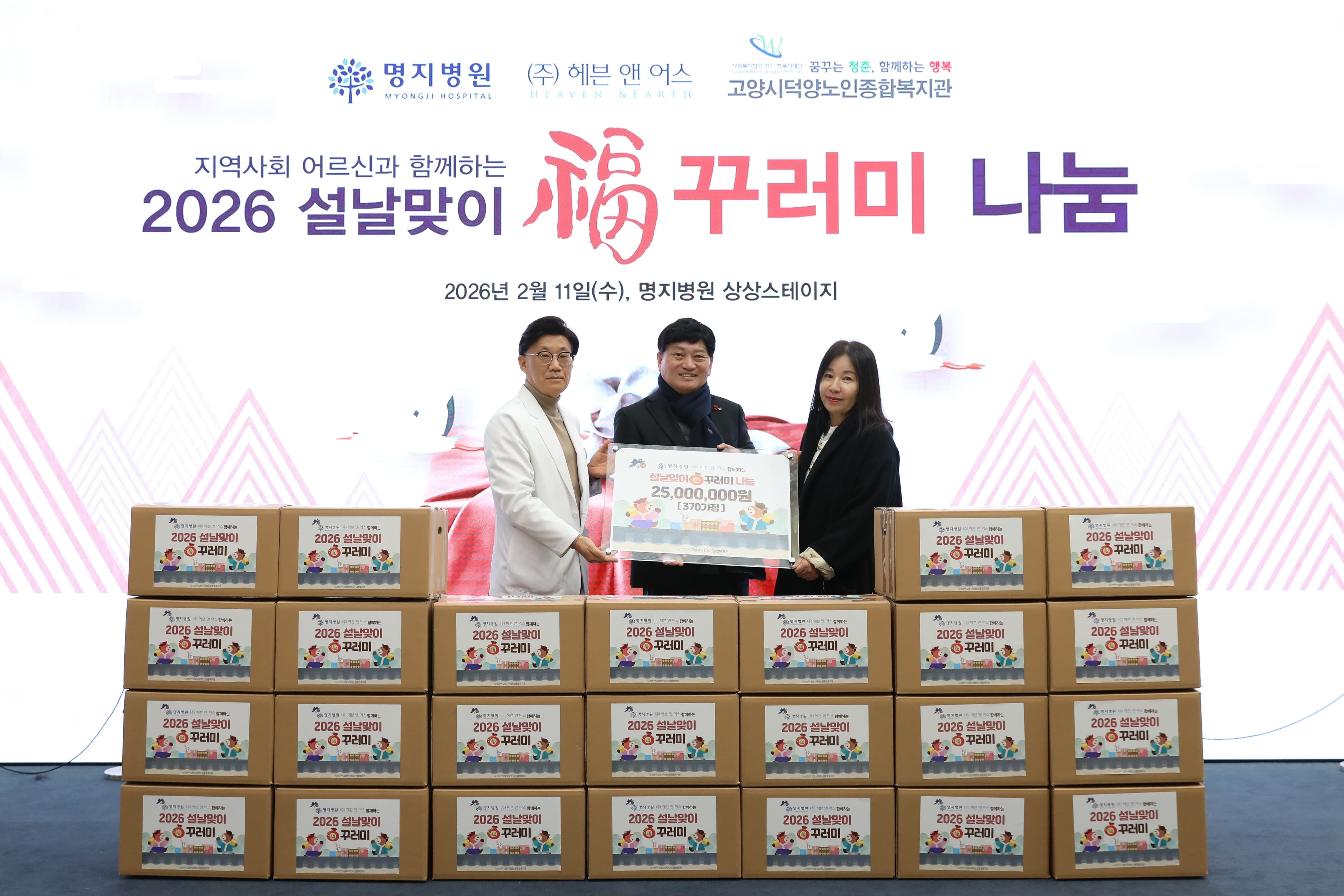(왼쪽부터) 김인병 명지병원장, 공상길 고양시덕양노인종합복지관장, 곽연숙 ㈜헤븐앤어스 대표. ©명지병원명지병원(병원장 김인병)이 설을 앞두고 지역 내 취약계층 어르신들의 든든한 명절나기 지원에 나섰다.