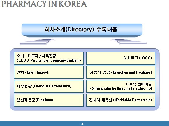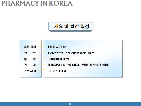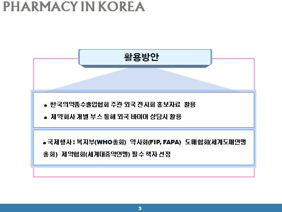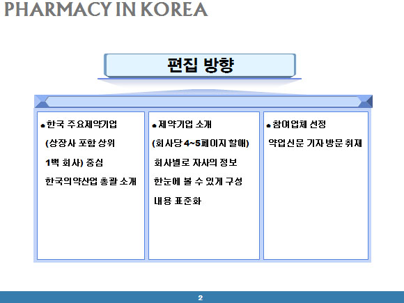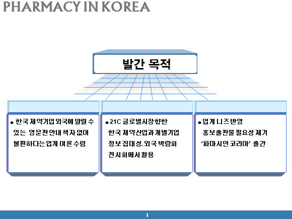 Pharmacy in Korea는 의약품관련 국제행사에 한국의 제약기업을 널리 알리는 홍보자료료 활용됨은 물론 국제적으로 개최되는 의약품 관련 박람회·전시 등에서 제약회사들이 해외 바이어와 상담시 유용한 자료로 활용될 것으로 기대됩니다.