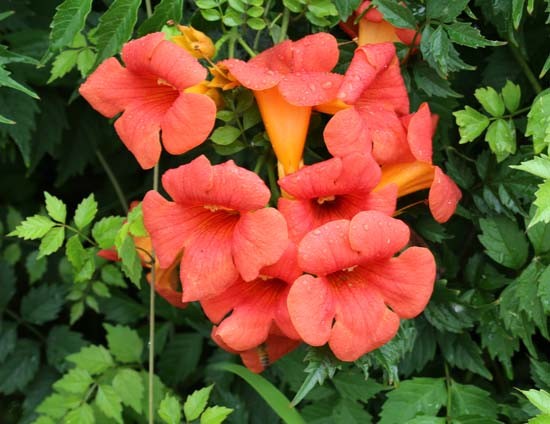 8-9월 한 여름에 가지 끝에 5-15 송이의 나팔꽃 모양의 주황색이나 짙은 적황색 꽃이 모여서 핀다. 꽃받침은 5개이고 꽃잎은 5개로 갈라지며 암술은 1개로 암술머리가 2개로 갈라져 주걱모양을 하고 있다. 수술은 4개로서 2개는 길고 2개는 짧다(이강웅예).