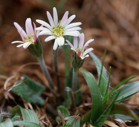 봄꽃은 3~5월 경 줄기 끝에 하늘을 향해서 하얀 꽃을 한 송이씩 피우며 꽃이 피기 전 꽃봉오리는 연한 자주색을 띠고 있다. 가을꽃은 9월경에 꽃을 피운다. 봄꽃은 혀 모양(설상화) 꽃잎이 수평으로 둥글게 배열되고 중심부에는 통 모양의 통상화가 자리한다.