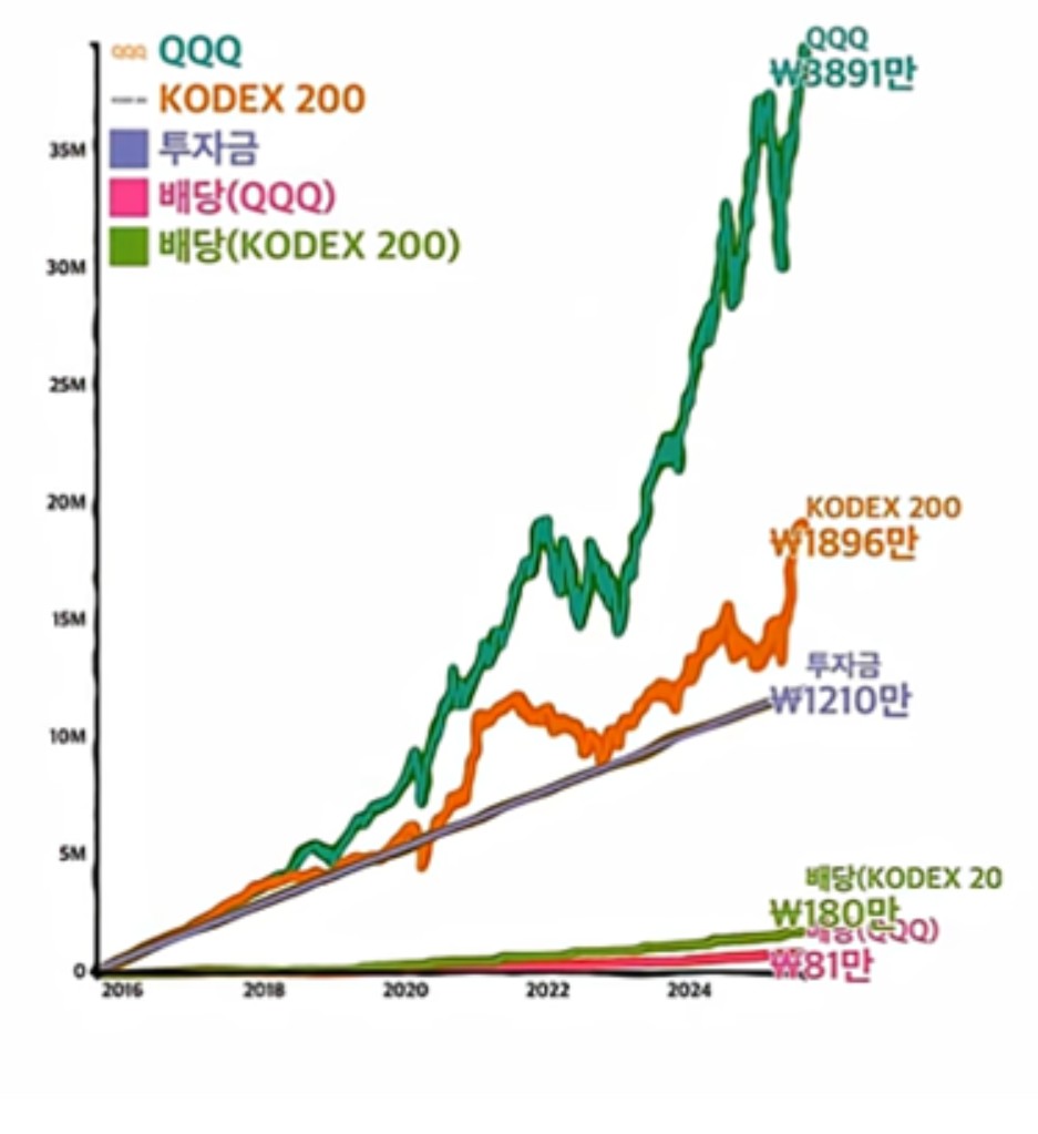 높은 투자수익를도 중요하지만 세금의 함정도 유의해야 한다. 아래 그래프는 미국의 Nasdaq 100지수에 기반하는 대표적 미국 ETF 상품인 QQQ와 한국의 코스피 200 지수에 기반하는 ETF상품인 KODEX 200에 2016년부터 매월 10만원씩 10년간 투자한 수익률을 비교한 것이다.