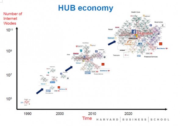 그렇다면 왜 디지털 변환기를 맞아 모든 경제주체가 디지털 리더십과 역량을 갖추는데 이렇듯 비상한 관심을 기울이는 것일까? 디지털 세계에는 잘 알려진 3가지 법칙이 있는데, 마이크로칩 저장능력이 18개월 마다 2배씩 증가한다는 ‘무어의 법칙’, 네트워크에 일정 수 이상의 사용자가 모이면 그 가치가 폭발적으로 증가한다는 ‘메칼프의 법칙’, 그리고 네트워크에는 더 많은 연결이 집중된 허브(hub)가 존재한다는 ‘바라바시의 법칙’이다. 실제로 ‘디지털 허브 경제’가 출현하면서 두번째와 세번째 법칙이 주목받고 있는데, 세간에 잘 알려진 아마존, 알파벳, 페이스북과 같은 플랫폼 기업들이 좋은 예이다(그림 1).