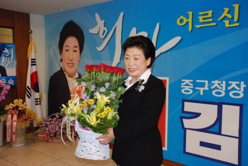 김은숙 부산 중구청장 후보(한나라당.65세)가 전국에서 여성으로 처음 재선의 영광을 안았다.