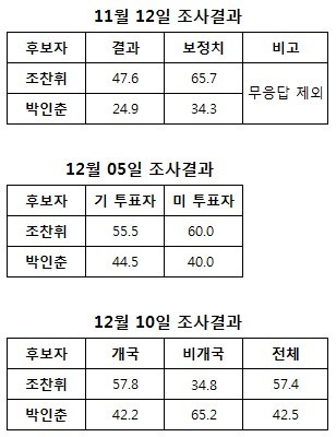 또 개표일 직전인 12월 10일과 11일 양일간 본지가 실시한 출구조사 성격의 여론조사에서도 조찬휘 후보 57.4%, 박인춘후보 42.5%의 지지율을 보여 준바 있다.