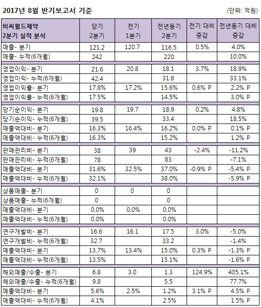 부문별로 매출(2분기)은 전기대비 '소폭 증가'(+0.5%), 전년대비 4.7억 증가(수출 5억 증가)했고, 누적 매출은 전년대비 22억 증가(국내매출 18억 증가, 수출 4억 증가)했다.