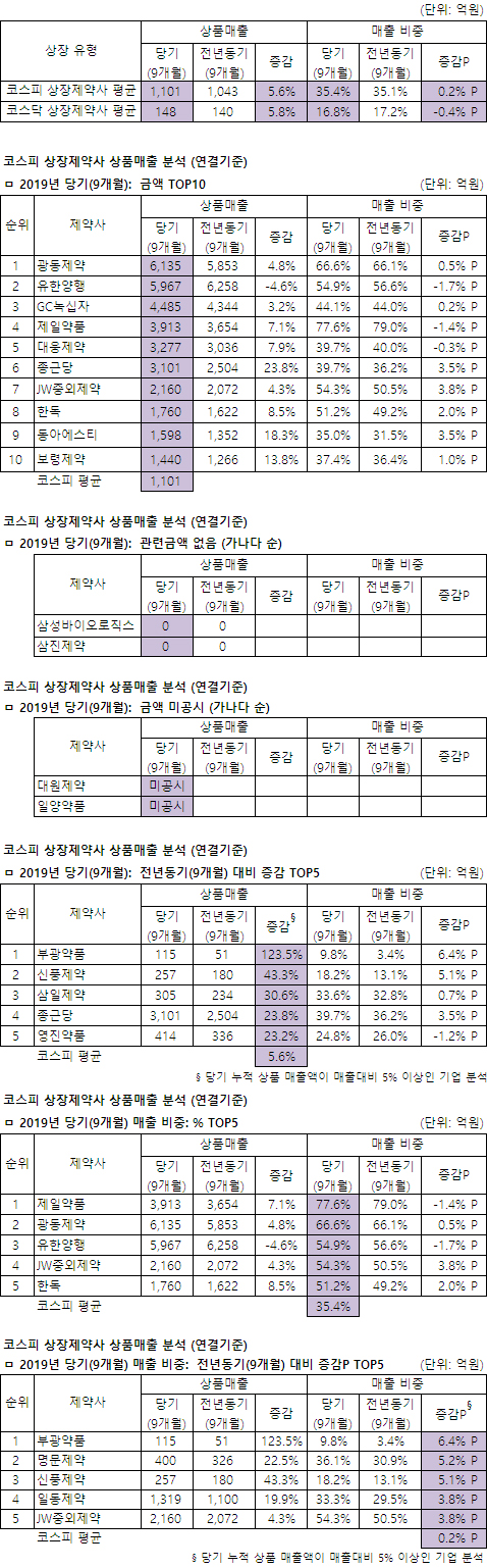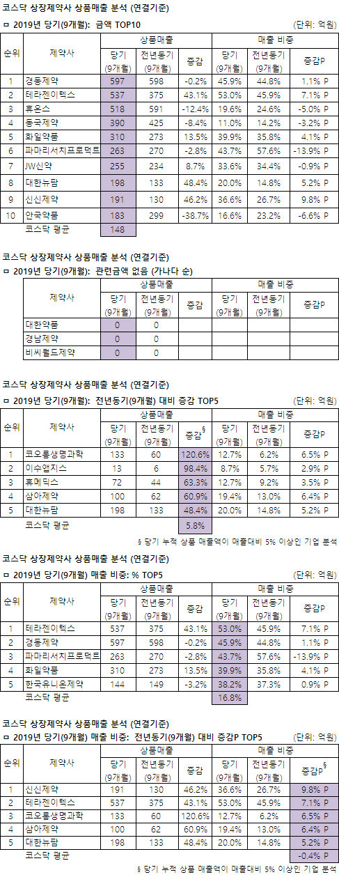 상품매출이 가장 많은 제약사는 코스피는 광동제약 코스닥은 경동제약, 전년동기대비 증감률이 가장 높은 제약사는 코스피는 부광약품 코스닥은 코오롱생명과학, 매출비 비중이 가장 높은 제약사는 코스피는 제일약품 코스닥은 테라젠이텍스, 전년동기 대비 증감P가 가장 높은 제약사는 코스피는 부광약품 코스닥은 신신제약으로 각각 나타났다.