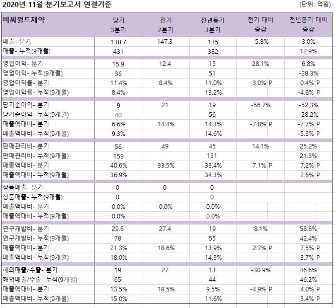 비씨월드제약은 11월 분기보고서 연결기준 3분기 누적 431억원의 매출을 달성, 전년동기대비 12.9% 성장했다