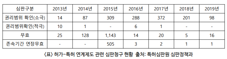 특히 판매금지 영향을 최소화하기 위해 도입된 특허도전 장려가 2019년까지 감소하는 경향을 보여 제도 효과가 없다고 지적했다. 2015년과 2019년을 비교해보면, 권리범위 확인(소극)은 309→98건으로, 무효는 1,143→16건, 존속기간 연장무효는 505→1건으로 줄었다.