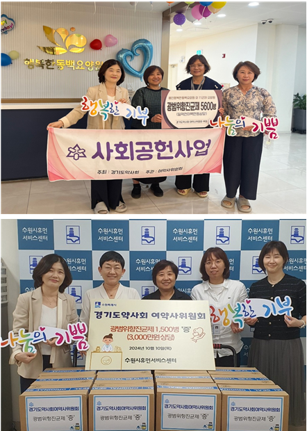 경기도약사회(회장 박영달) 여약사위원회(부회장 조수옥, 여약사위원장 이경희, 박남조)가 지난 5일과 10일 각각 행복한동백요양원, 수원시휴먼서비스센터에서 기부의약품 전달식을 가졌다.