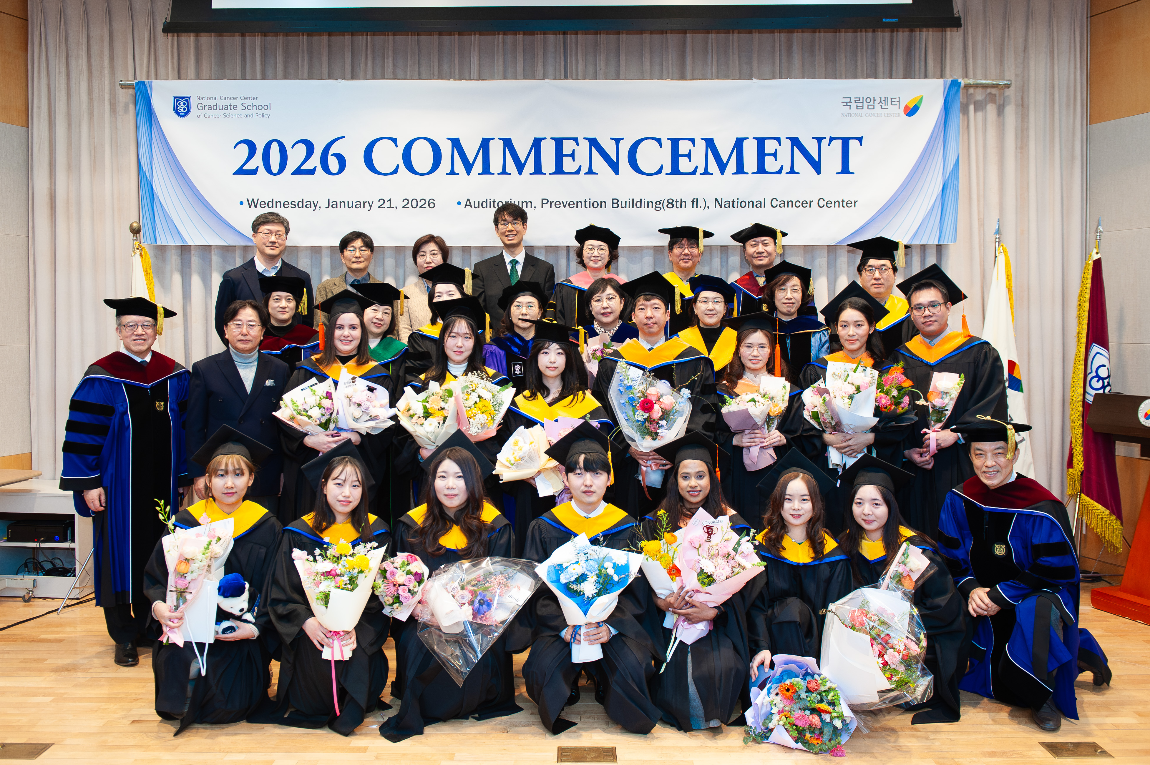 국립암센터국제암대학원대학교(총장 양한광)는 지난 21일 국립암센터 국가암예방검진동 8층 대강의실에서 ‘2026년 전기 학위수여식’을 갖고, 보건학·이학 석사 12명(한국 7명, 스리랑카 1명, 베트남 3명, 브라질 1명)과 보건학·이학 박사 3명(한국 3명) 총 15명의 졸업생을 배출했다고 22일 밝혔다.