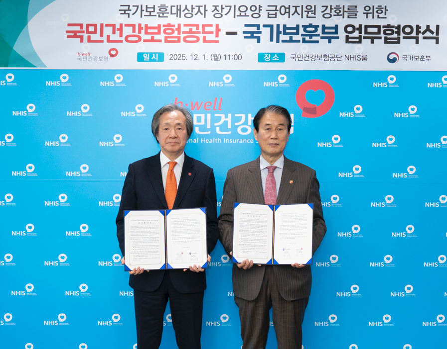 국민건강보험공단(이사장 정기석, 이하 공단)과 국가보훈부(장관 권오을, 이하 보훈부)는 1일 공단 원주 본부에서 '국가보훈대상자의 장기요양급여 이용지원 강화'를 위한 업무협약(MOU)을 체결했다.
