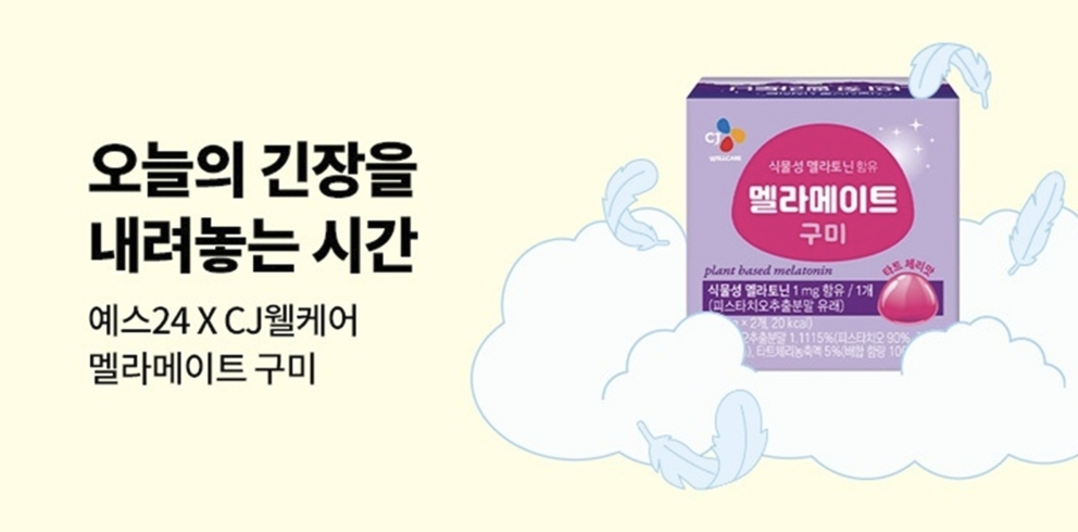 건강기능식품 전문기업 CJ웰케어는 국내 온라인 서점 예스24와 협업해 ‘멜라메이트 구미’ 제품을 체험할 수 있는 ‘오늘은 긴장을 내려놓는 시간’ 프로모션을 진행한다.