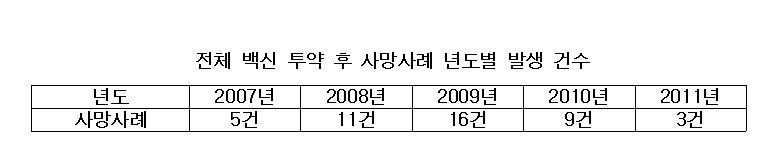 양승조 의원에 따르면 최근 5년간 예방접종 백신을 접종 받은 후 사망 신고된 사례가 2007년 5건, 2008년 11건, 2009년 16건, 2010년 9건, 2011년 3건으로 조사됐다고 밝혔다.