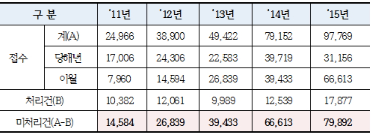 연도별 누적 미처리건수를 살펴보면 2011년 14,584건, 2012년 26,839건, 2013년 39,433건, 2014년 66,613건, 2015년 79,892건으로 해마다 폭증했다.
