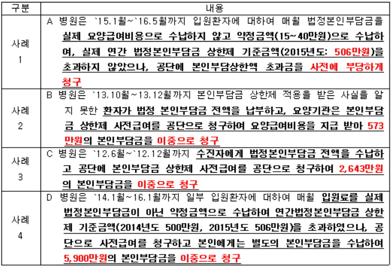 소득수준에 따라 의료비 상한액을 정해 이를 초과한 경우 본인부담금을건보공단에서 부담하는 ‘본인부담상한제’가 의료기관의 허위·부당청구 수단으로 악용되고 있다.