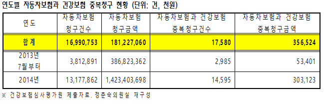 정춘숙 더불어민주당 의원에게 건강보험심사평가원이 제출한 자료에 따르면, 2013년7월~2014년까지 자동차보험과 건강보험을 중복으로 청구한 의료기관을 조사한 결과, 17,580건을 적발하고, 356백만원을 환수처리한 것으로 4일 국정감사에서 확인됐다.